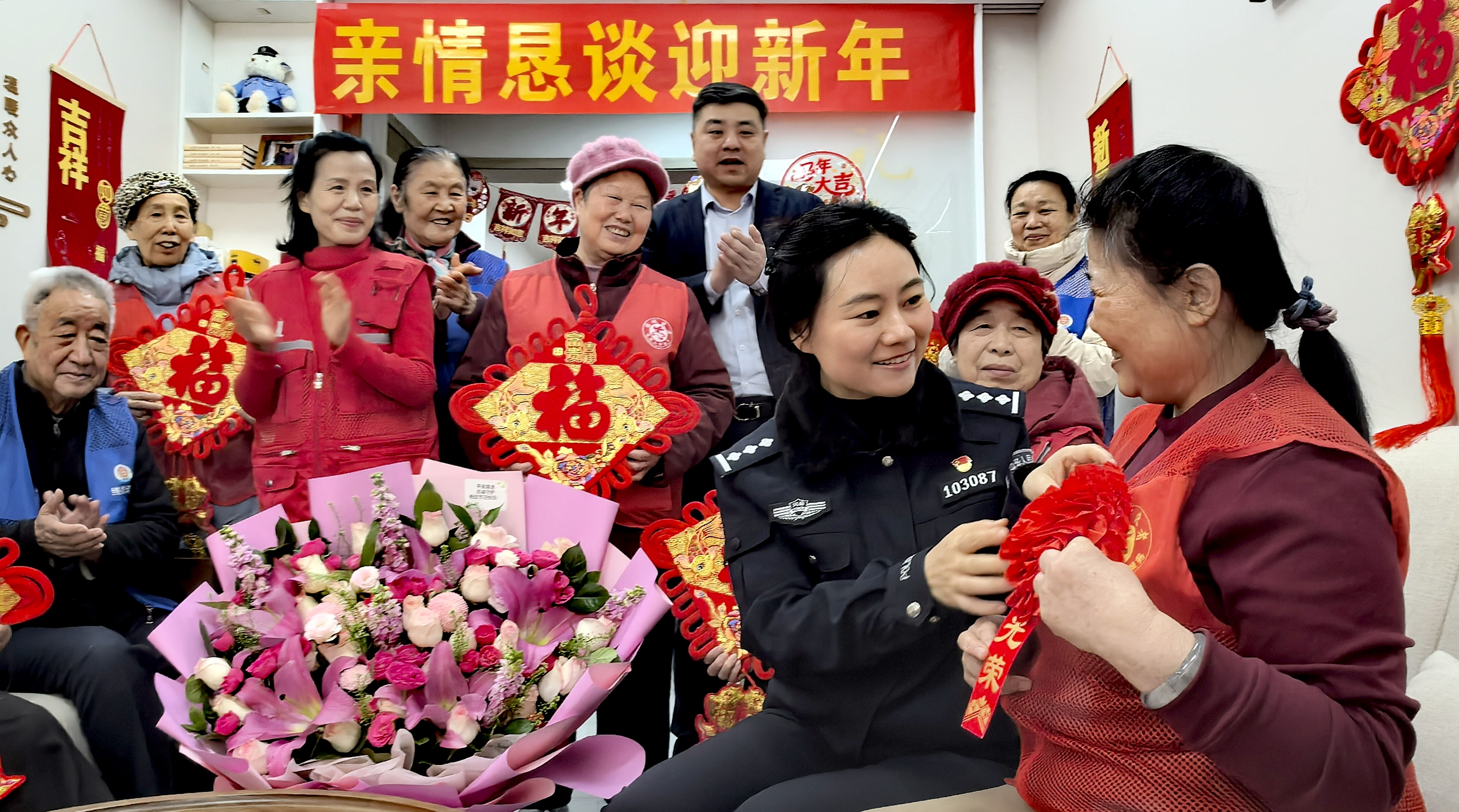 12月29日,鄭州市公安局金水分局經(jīng)八路派出所的民警輔警在轄區(qū),在親情聯(lián)誼會(huì)上講法治,講安全警民同行,特意為治安老先進(jìn)模范被戴上朵朵大紅花表彰,喜洋洋,人人還有大紅“福”共享。
