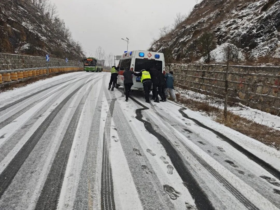 1月19日上午10時(shí)許,南召縣交警大隊(duì)特勤中隊(duì)4名民輔警執(zhí)行巡邏任務(wù)時(shí),發(fā)現(xiàn)一輛救護(hù)車(chē)因路面結(jié)冰打滑,被困在冰雪中無(wú)法前行。巡邏民輔警立即上前實(shí)施救援,得知這輛救護(hù)車(chē)正在執(zhí)行急救任務(wù),運(yùn)送兩名交通事故受傷人員前往醫(yī)院。面對(duì)這一“急上加急”的緊急情況,巡邏民輔警二話(huà)沒(méi)說(shuō),俯身在冰冷的雪地上用力推車(chē),將救護(hù)車(chē)推出被困區(qū)域,回到安全路面。在確認(rèn)救護(hù)車(chē)行駛狀態(tài)正常后,巡邏民輔警駕駛警車(chē)開(kāi)道護(hù)航,引導(dǎo)救護(hù)車(chē)避開(kāi)結(jié)冰路段,順利駛?cè)胫鞲傻馈?/p>