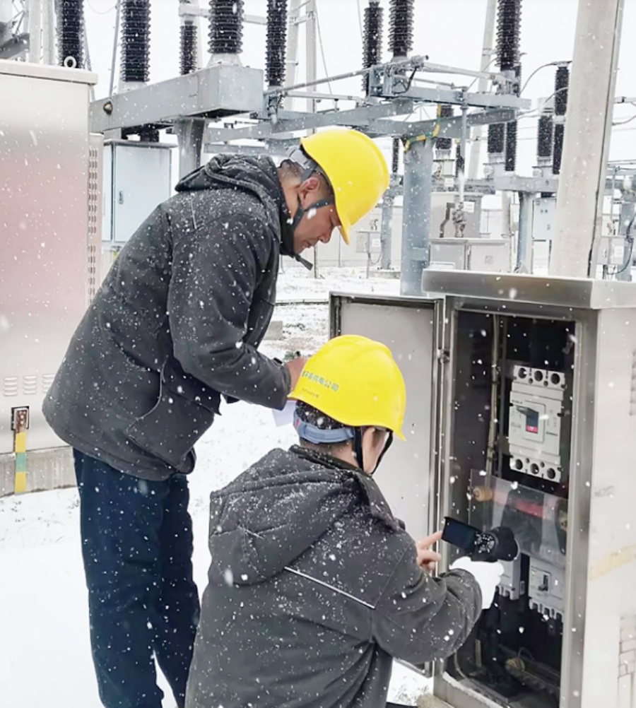 當(dāng)天, 社旗縣郊外,風(fēng)雪交加,氣溫低至零下3℃。 運(yùn)維人員姚濤與同事手持紅外測(cè)溫儀,對(duì)10千伏社供五線(xiàn)長(zhǎng)安明珠小區(qū)支線(xiàn)電纜分接箱接頭進(jìn)行測(cè)溫,通過(guò)屏幕上顯示的溫度數(shù)據(jù),判斷線(xiàn)路運(yùn)行狀態(tài)。在田間地頭,同樣能感受到保障供電的溫暖力量。新野縣城郊供電所工作人員楊景會(huì)頂風(fēng)冒雪趕到宛綠蔬菜專(zhuān)業(yè)合作社,對(duì)冷庫(kù)供電設(shè)施進(jìn)行專(zhuān)項(xiàng)檢查。在宛城區(qū)老舊小區(qū),供電公司工作人員逐棟排查電表箱、分支箱,防止積雪滲入引發(fā)故障,全力保障居民用電安全、穩(wěn)定。