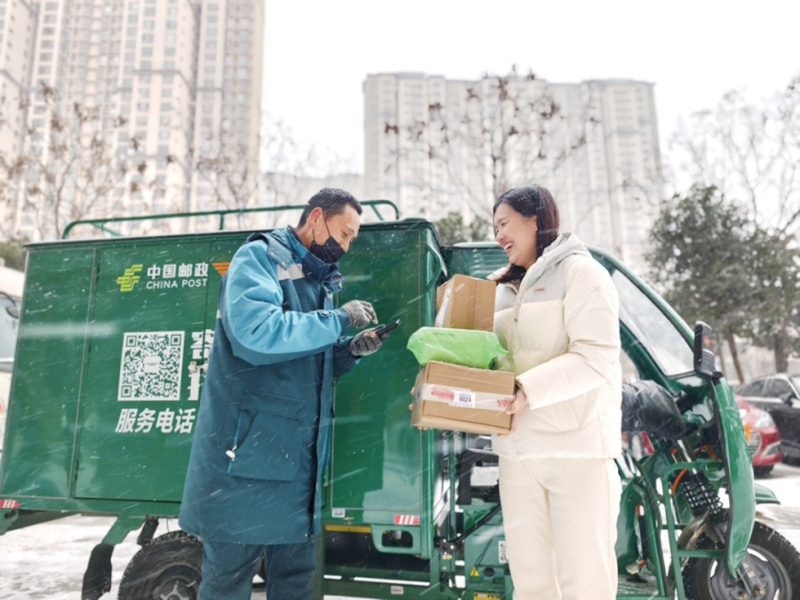 南陽(yáng)市郵政分公司的郵遞員們?yōu)榭蛻?hù)及時(shí)送去遠(yuǎn)方郵寄來(lái)的包裹。